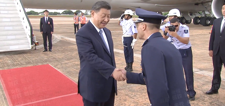 当地时间11月19日下午,国家主席习近平乘专机抵达巴西利亚,开始对巴西进行国事访问。